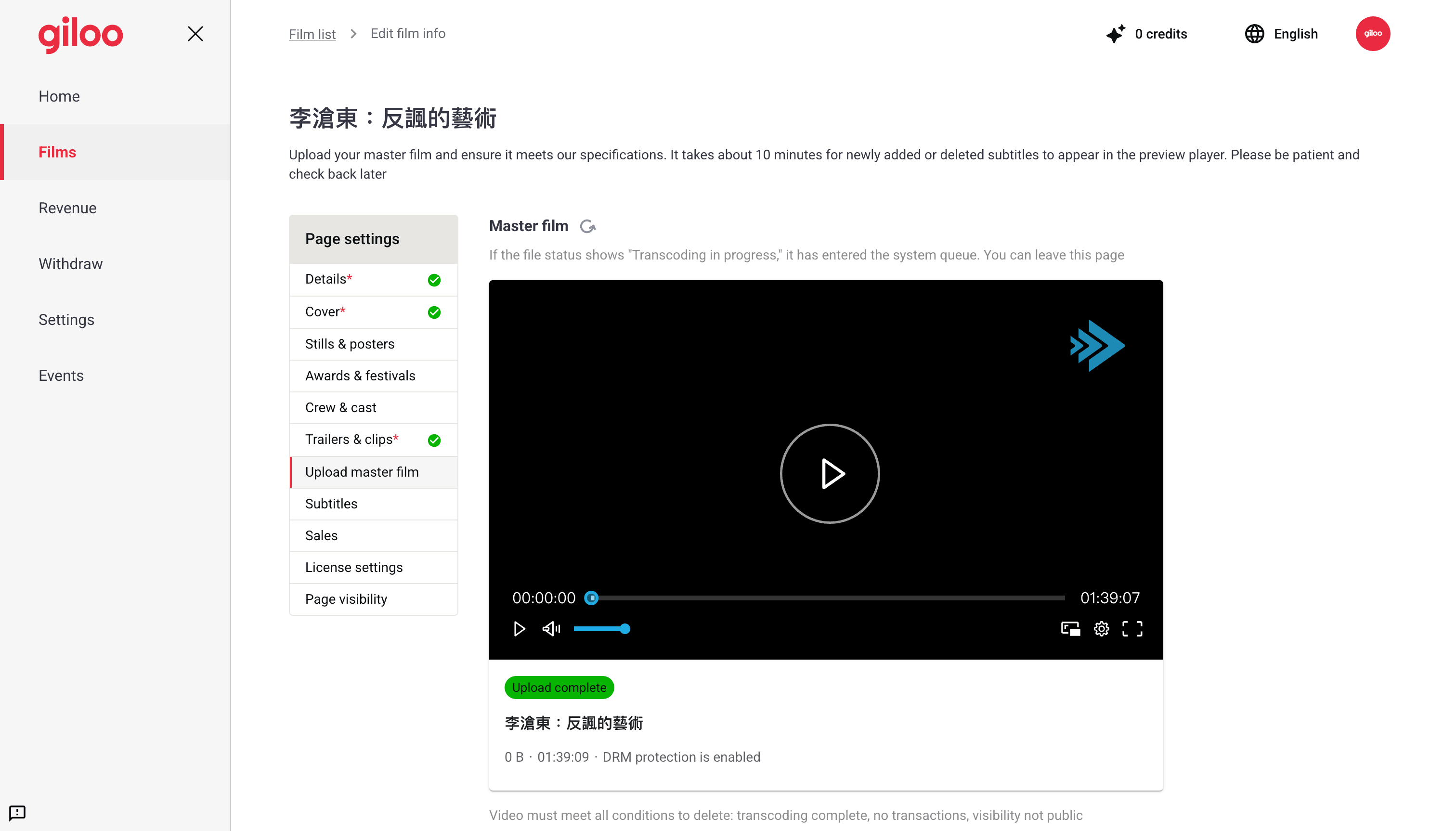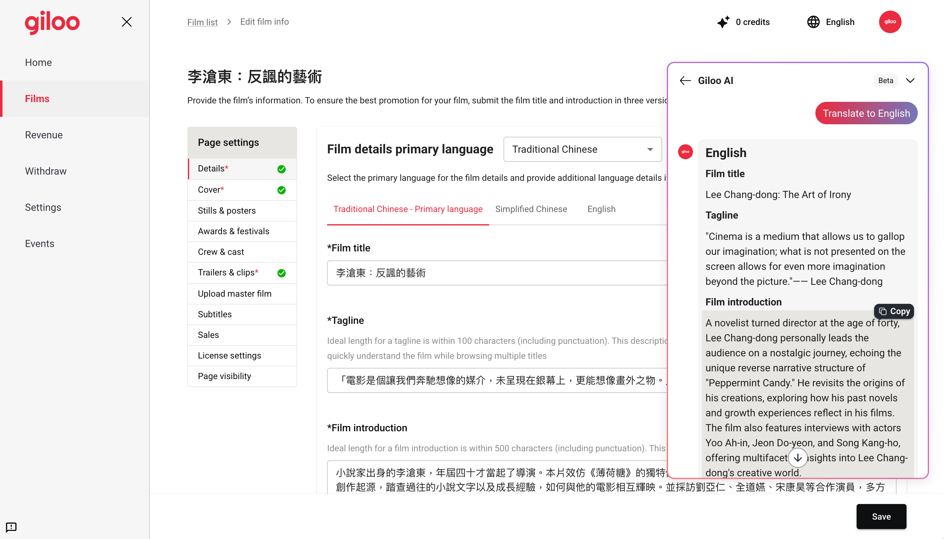 The core of the platform was an video editing workflow covering basic info, cover images, cast and crew, main video upload, trailers, subtitles, stills, awards, licensing, purchase status, and publishing settings. Each step had independent form validation built on Zod and react-hook-form, with per-language field validation handled by a centralized validation engine. Video uploads used the Tus resumable upload protocol, integrated with both Vimeo and an internal video service, supporting large file uploads with automatic resume on connection failure.