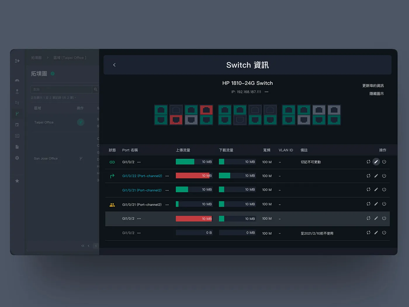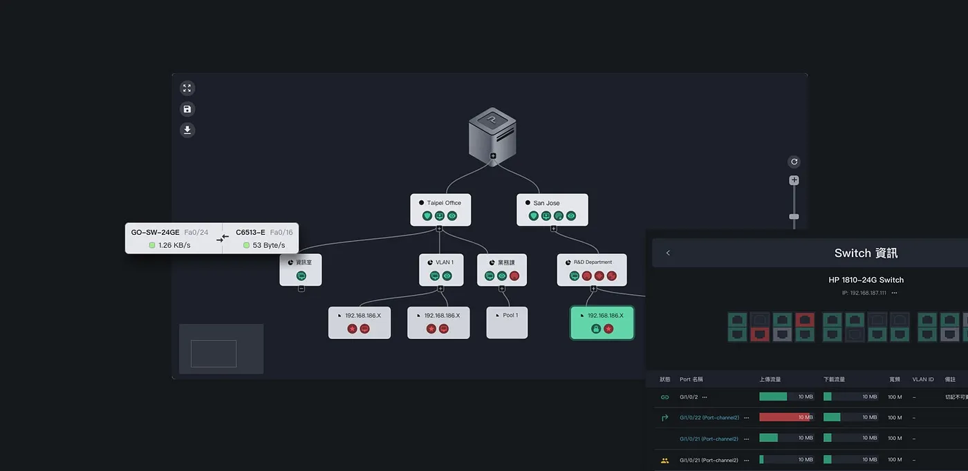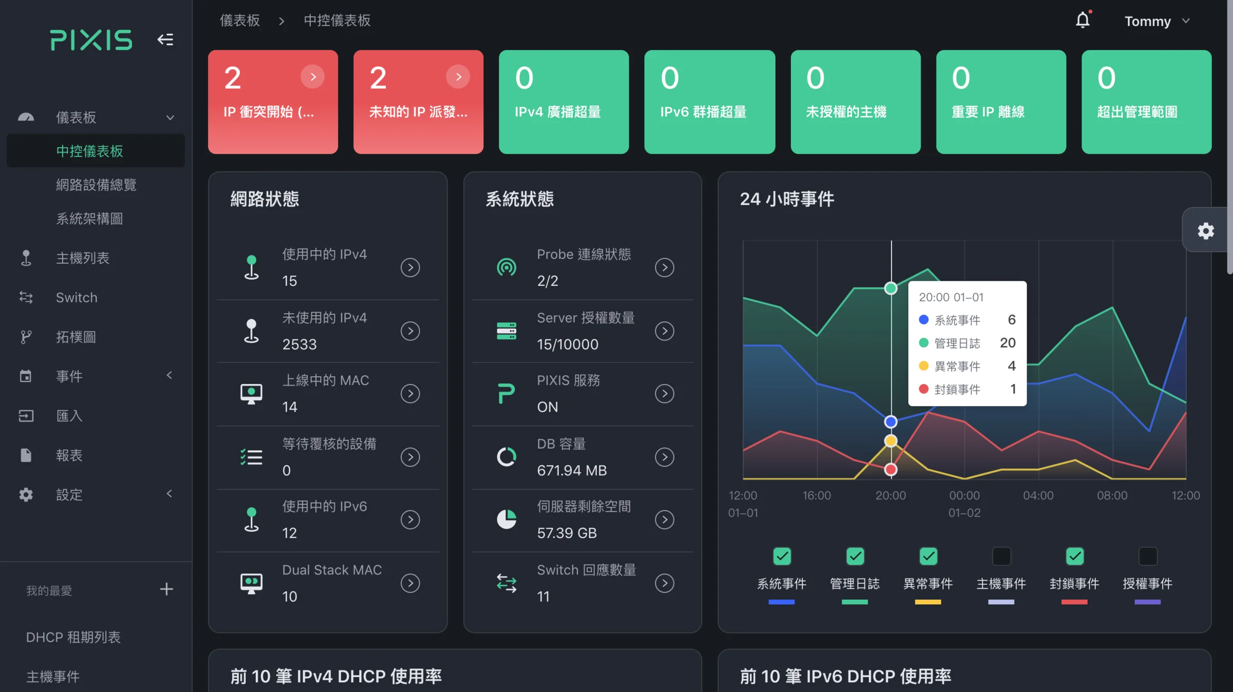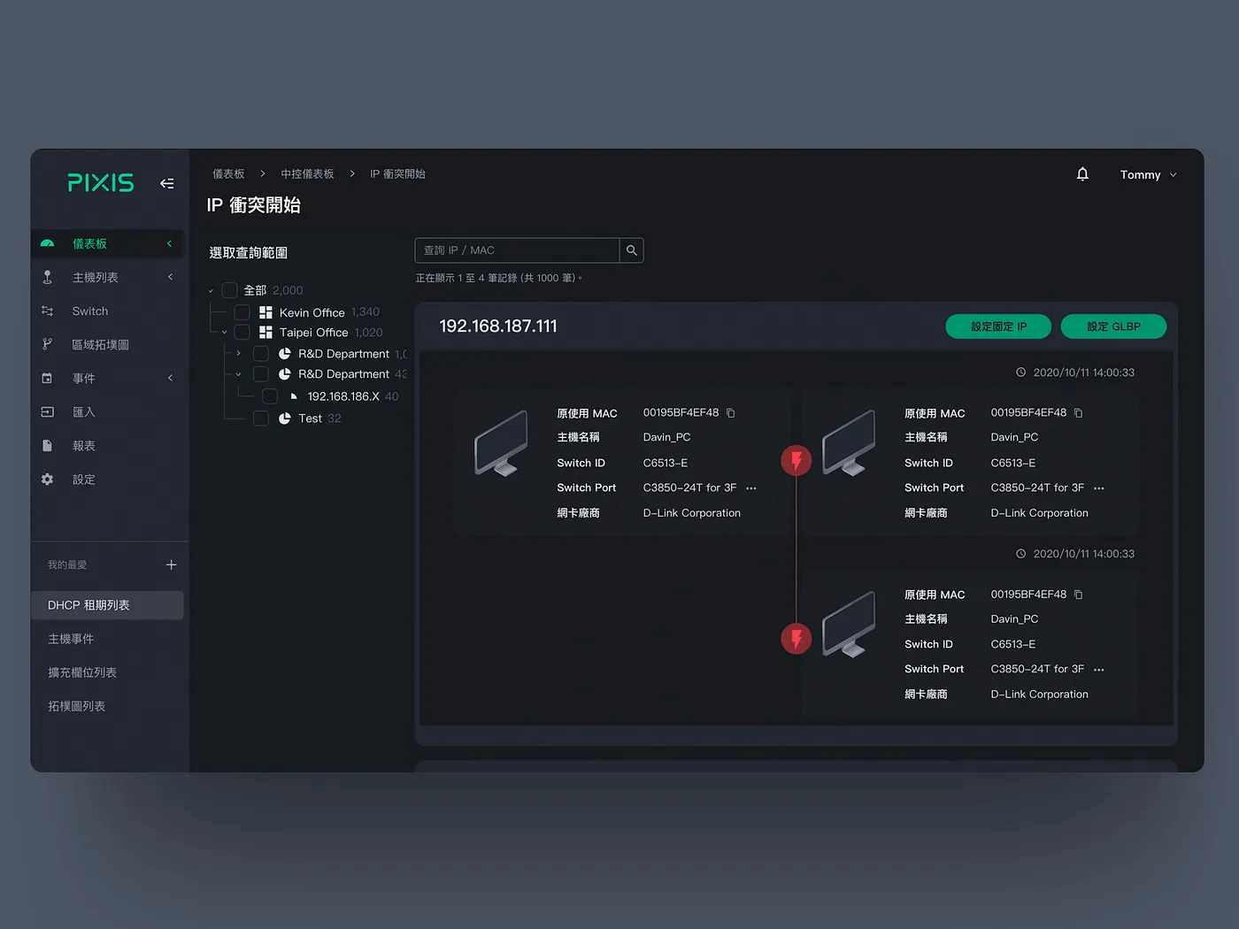 PIXIS is an enterprise network management system built for IT and network administrators overseeing complex, multi-site infrastructure. The platform provided a centralized interface for device discovery and inventory, network topology visualization, DHCP configuration, IP conflict detection, audit logging, and compliance rule enforcement across multiple organizational sites. Administrators could monitor switches, track host devices, and investigate security events from a customizable dashboard with draggable panels. The project was delivered as a fully functional frontend with mock API integration, dark/light theme support, and bilingual (English/Traditional Chinese) internationalization.